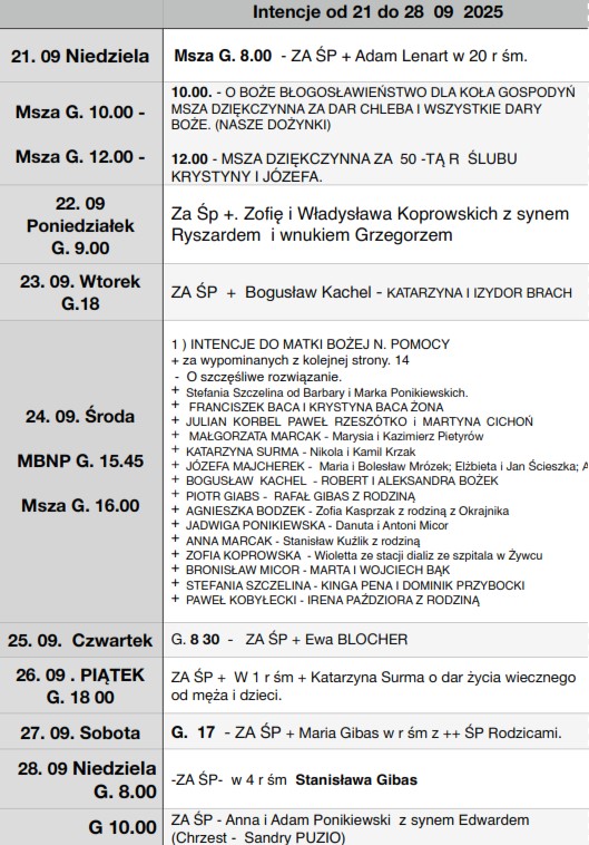 - W środę (24. IX.) Msza święta z nowenną do MBNP o godz. 16. Po Mszy św. zapraszamy Rodziców dzieci przygotowujących się do I Komunii św. na spotkanie w kościele.