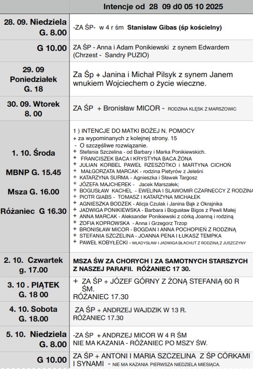 - W środę (24. IX.) Msza święta z nowenną do MBNP o godz. 16. Po Mszy św. zapraszamy Rodziców dzieci przygotowujących się do I Komunii św. na 2 potkanie w kościele.
