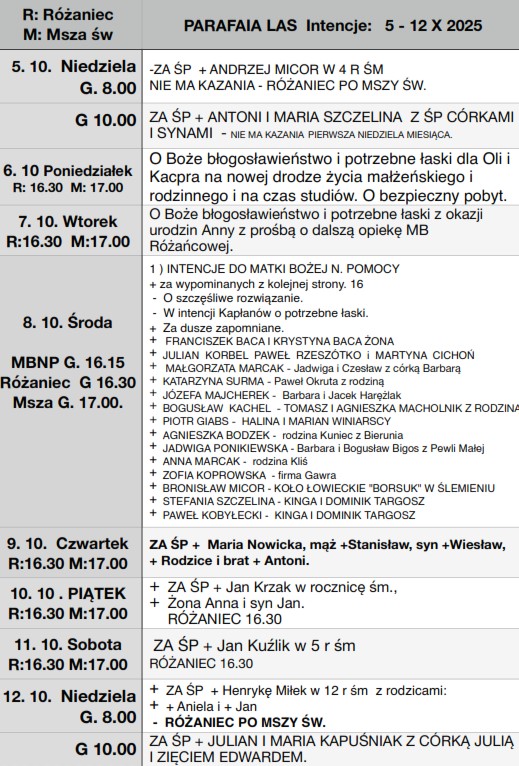 • W środę (8. X.) Msza święta godz. 17. – Godz. 16 15 Różaniec. Połączony z nabożeństwem do Matki Bożej Nieustającej Pomocy. Wystawienie od godziny 16.15.
