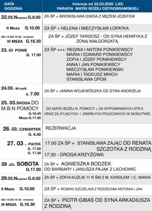 - W okresie Wielkiego Postu w niedziele jest dodatkowa Droga Krzyżowa o g. 15 30, a o g. 16.00 Gorzkie Żale i około 16.30 zostanie odprawiona Msza święta.