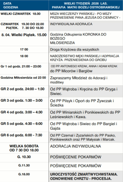 - Liturgię Wigilii Paschalnej rozpoczniemy w Wielką Sobotę o godz. 18:00. W czasie liturgii będzie odnowienie przyrzeczeń chrzcielnych, na które należy zabrać świece. Po zakończeniu obchodów Wielkiej Soboty nastąpi procesja Rezurekcyjna ogłaszająca Zmartwychwstanie Chrystusa. Na procesję zapraszam Strażaków z pocztami sztandarowymi, Koło Gospodyń w strojach regionalnych, panie i panów do niesienia feretronów, dzieci do sypania kwiatów, młodzież do niesienia relikwii i całą wspólnotę parafialną zgromadzoną wokół tajemnicy wezwania Matki Bożej Ostrobramskiej.